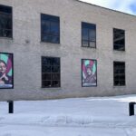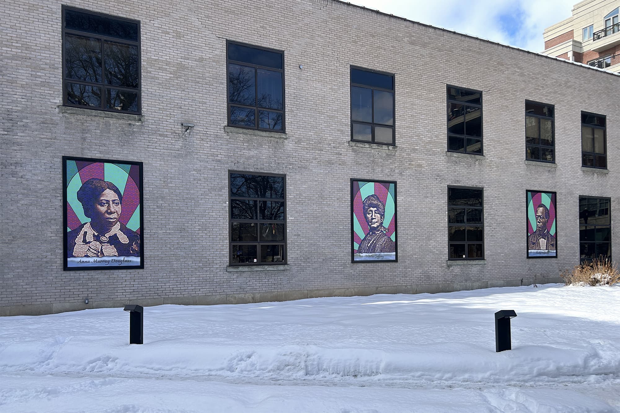 Harris’s tryptic incorporates the silhouette of a lancet window, echoing the stained glass found nearby in Christ Church. Each figure is framed by sunray backgrounds in Pan-African colors of red and green, while a pattern of Rochester’s iconic flower logo (created 50 years ago and being celebrated throughout the City in 2026) fills their surroundings. The name panel at the base of each portrait resemble the wake of Lake Ontario, symbolizing the ripple effects of their legacies, and also nods at the artist’s past video work In Their Wake.